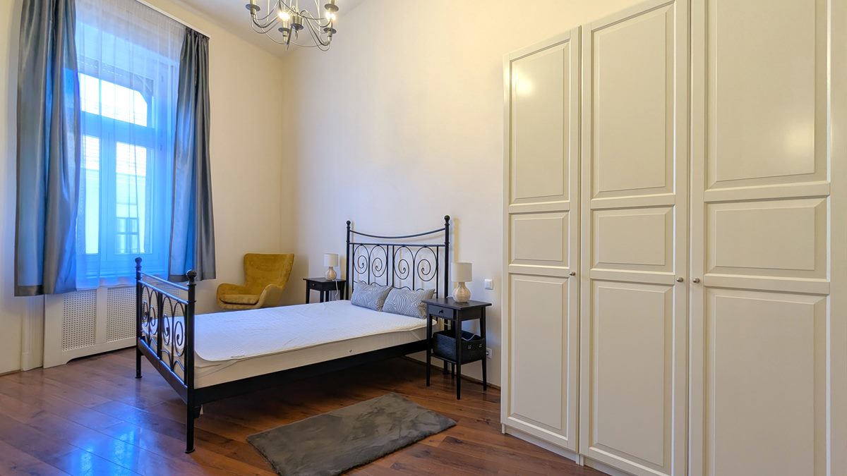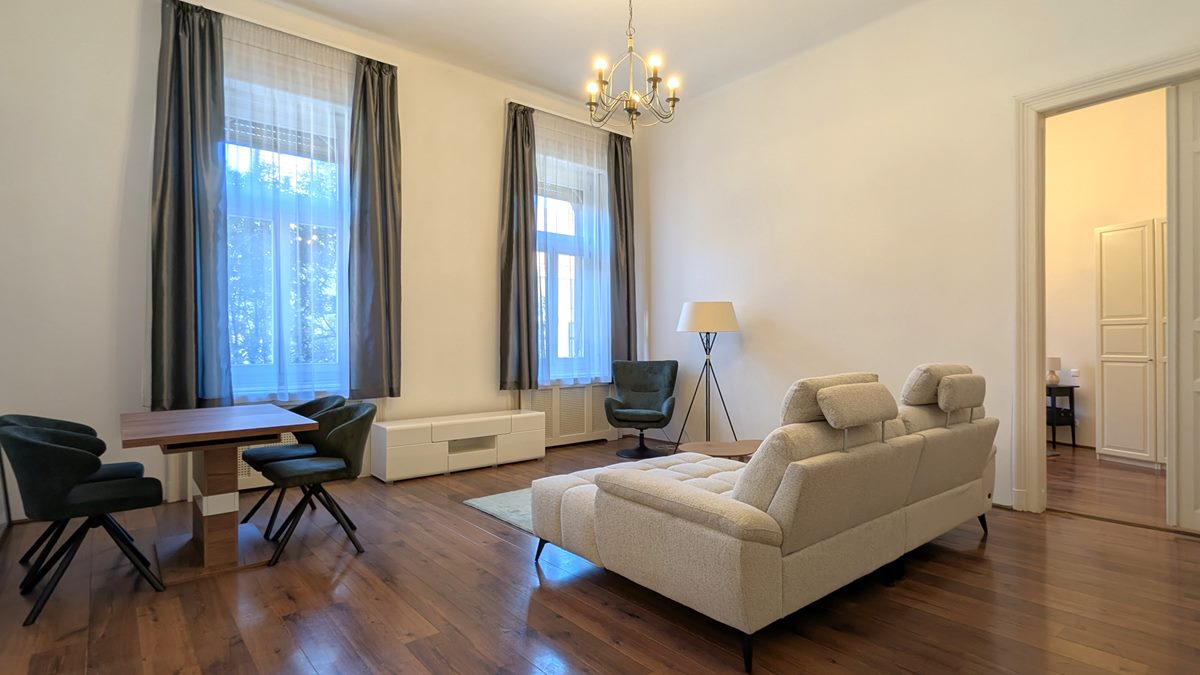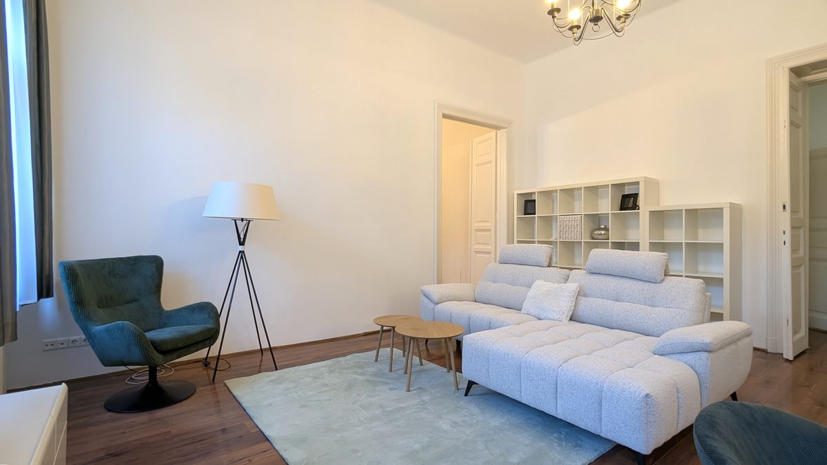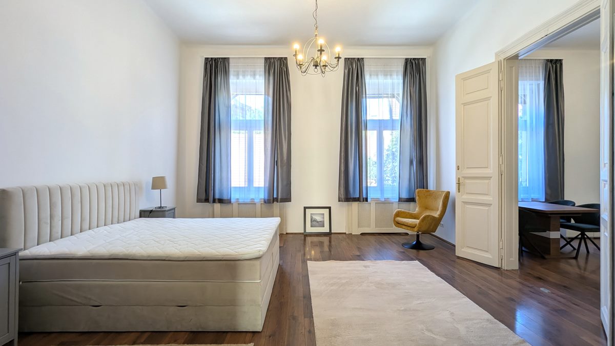 2 bedroom apartment is available for rent in Budapest. The property is located in the 9th District of Budapest, in Raday street which is famous for its cafes and restaurants, and the National Museum, Semmelweis and Corvinus Universities are within a couple of minutes of walk. Excellent public transport options with metro line 3 and 4, tram line 47-49, and several buses. The apartment is situated on 1st floor of a well-kept, classical building, it consists of a large living room, separate, fully equipped kitchen with dining area, 2 bedrooms and 2 bathrooms. Fully furnished and equipped, it is available immediately
